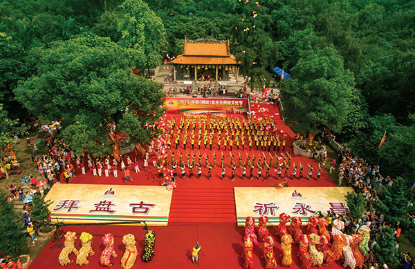 盤古王公園は花都區獅嶺鎮の北部に位置する。この観光地について気勢は奇特で、清代時期に「花県八景」の一つ、「盤古煙霞」と呼ばれている。盤古王廟は従來から香火は絶えず、遠近でも有名になっている。毎年舊暦八月十二に盤古王の誕生日で、各地の善男善女は群れを組んで、太鼓をたたきながら獅子舞をして、盛んに慶祝して、遠近で數萬人が到來して參拝している。