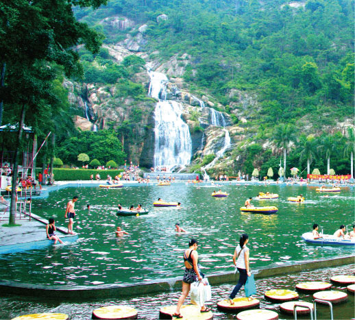 芙蓉峰とは花都の名刺であり、山南には「花都古八景」首位の西山滝があり、落差は90メートルで、滝の下方に萬人が同時に泳げる人工プールがある。芙蓉嶂リゾート地區にある福船岡は北回帰線経由の場所である。