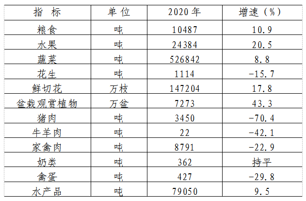 全年肉類總產量1.23萬噸,比上年下降47.2%。其中豬肉產量0.35萬噸,下降70.4%;家禽肉產量0.88萬噸,下降22.9%。全年水產品產量7.91萬噸,增長9.5%。