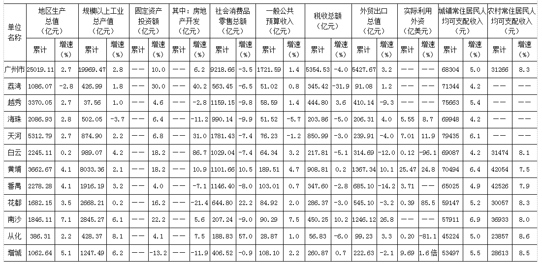 2020年1-12月廣州市各區主要經濟指標對比表