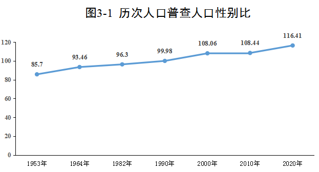 全區常住人口[2]中,男性人口為883456人,占53.79%;女性人口為758904人,占46.21%。總人口性別比(以女性為100,男性對女性的比例)由2010年第六次全國人口普查的108.44上升為116.41。