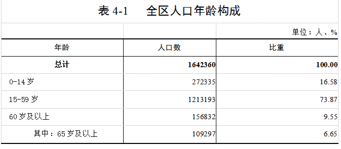 全區(qū)常住人口[2]中,0-14歲[3]人口為272335人,占16.58%;15-59歲人口為1213193人,占73.87%;60歲及以上人口為156832人,占9.55%,其中65歲及以上人口為109297人,占6.65%。與2010年第六次全國人口普查相比,0-14歲人口的比重提高4.52個(gè)百分點(diǎn),15-59歲人口的比重下降4.70個(gè)百分點(diǎn),60歲及以上人口的比重提高0.18個(gè)百分點(diǎn),65歲及以上人口的比重提高0.45個(gè)百分點(diǎn)。