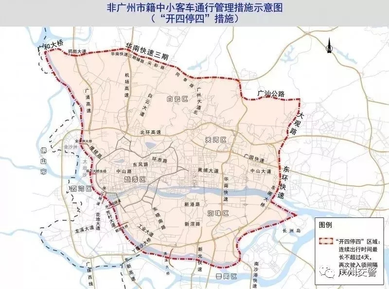 非廣州市籍中小客車通行管理措施,即“開四停四”管理措施7月1日正式實施為便于市民熟悉《通告》措施,7月為執法過渡期,目前,執法過渡期即將結束,8月1日起對進入管控區域通行的非廣州市籍中小客車廣州交警將進行拍攝取證。