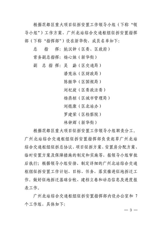 廣州市花都區人民政府辦公室關于印發廣州北站綜合交通樞紐征地拆遷安置指揮部工作方案的通知【花府辦〔2017〕8號】