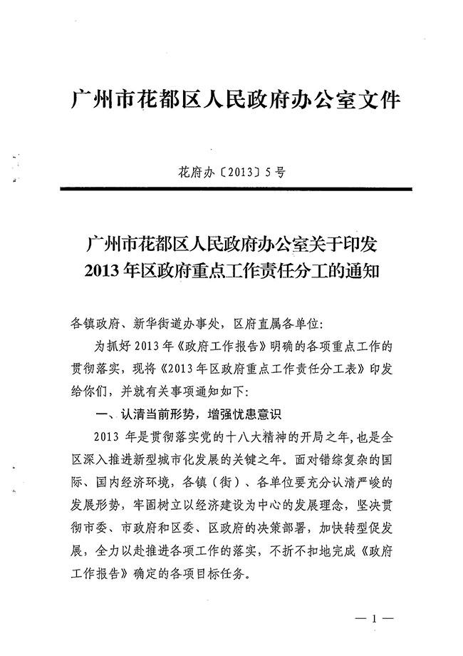 廣州市花都區(qū)人民政府辦公室關于印發(fā)2013年區(qū)政府重點工作責任分工的通知 【花府辦[2013]5號】