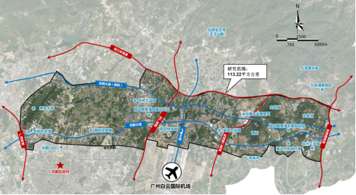 機場北側113平方公里,東至京港澳高速,西至秀全水庫,南至白云機場,北至珠三環高速。