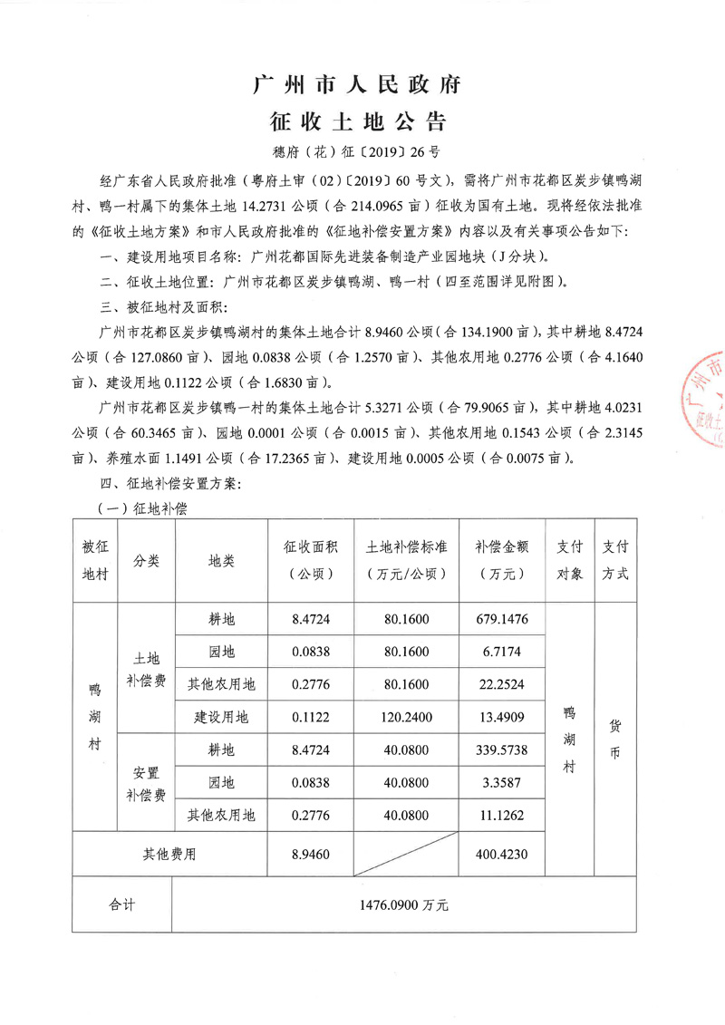 廣州市人民政府征收土地公告--穗府(花)征〔2019〕26號
