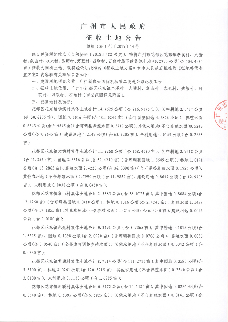 廣州市人民政府征收土地公告--穗府(花)征〔2019〕14號