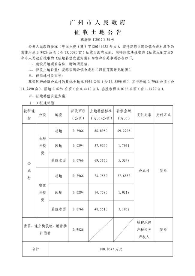 廣州市人民政府征收土地公告——穗府征〔2017〕30號