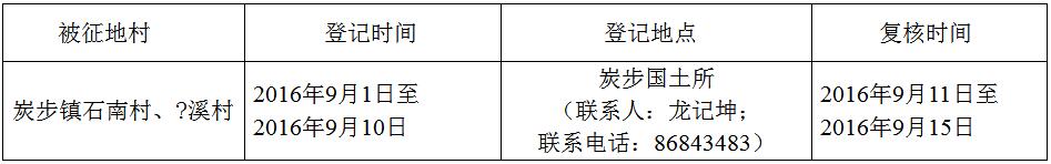 經省人民政府批準(粵國土資(建)字〔2016〕241號文),需將廣州市花都區炭步鎮石南村、?溪村屬下的集體土地3.2885公頃(合49.3275畝)征收為國有土地。現將經依法批準的《征收土地方案》和市人民政府批準的《征地補償安置方案》內容以及有關事項公告如下:
