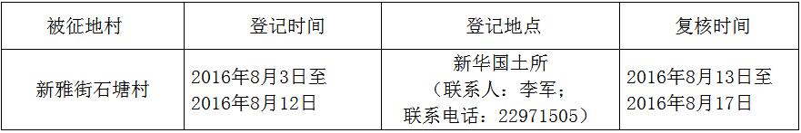 經(jīng)省人民政府批準(粵國土資(建)字〔2016〕281號文),需將廣州市花都區(qū)新雅街石塘村屬下的集體土地2.3862公頃(合35.79畝)征收為國有土地。現(xiàn)將經(jīng)依法批準的《征收土地方案》和市人民政府批準的《征地補償安置方案》內(nèi)容以及有關事項公告如下: