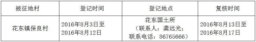 經(jīng)省人民政府批準(zhǔn)(粵國土資(建)字〔2016〕281號文),需將廣州市花都區(qū)花東鎮(zhèn)保良村屬下的集體土地2.2196公頃(合33.29畝)征收為國有土地。現(xiàn)將經(jīng)依法批準(zhǔn)的《征收土地方案》和市人民政府批準(zhǔn)的《征地補(bǔ)償安置方案》內(nèi)容以及有關(guān)事項(xiàng)公告如下: