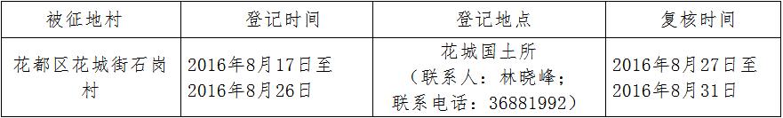 經(jīng)省人民政府批準(zhǔn)(粵國土資(建)字[2016]426號文),需將廣州市花都區(qū)花城街石崗村屬下的集體土地8.7115公頃(合130.6725畝)征收為國有土地。現(xiàn)將經(jīng)依法批準(zhǔn)的《征收土地方案》和市人民政府批準(zhǔn)的《征地補(bǔ)償安置方案》內(nèi)容和有關(guān)事項公告如下: