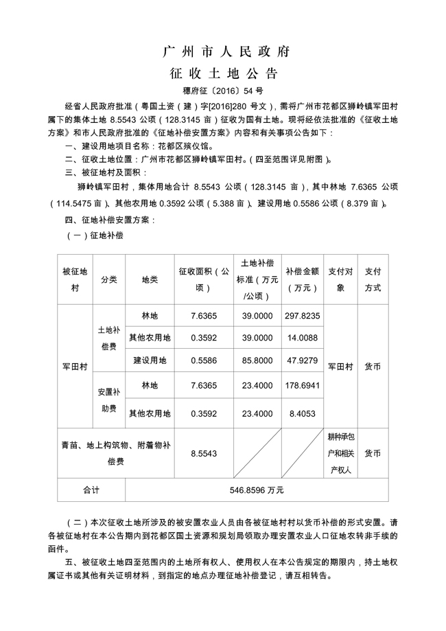 廣州市人民政府征收土地公告——穗府征〔2016〕54號