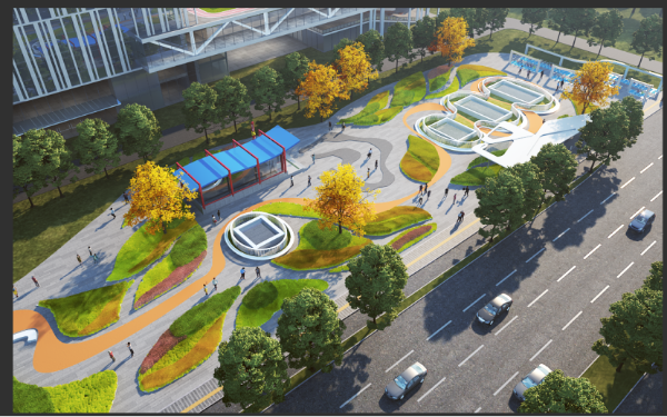 廣花城際鳳凰南路站共設(shè)5個(gè)出入口,3組風(fēng)亭,位于鳳凰南路與永利路交叉口,地處花都區(qū)科創(chuàng)制造區(qū),也是花都湖景觀風(fēng)貌綠心的重要節(jié)點(diǎn)。為確保車站出入口、風(fēng)亭等設(shè)施在風(fēng)格、色調(diào)上與周邊城市風(fēng)貌協(xié)調(diào)統(tǒng)一,縫合城市空間,在審批過程中,該局引入場(chǎng)地設(shè)計(jì)理念: